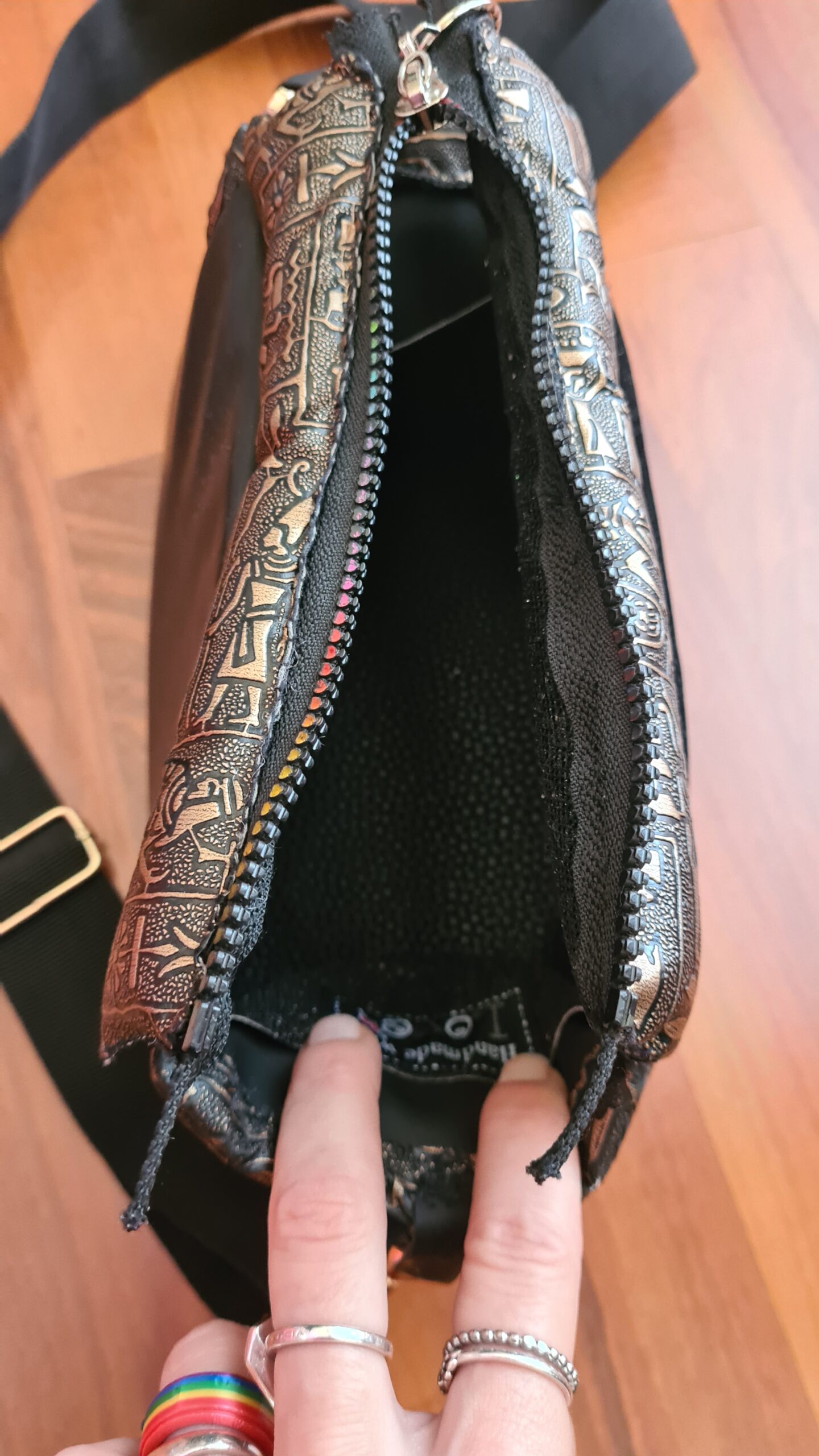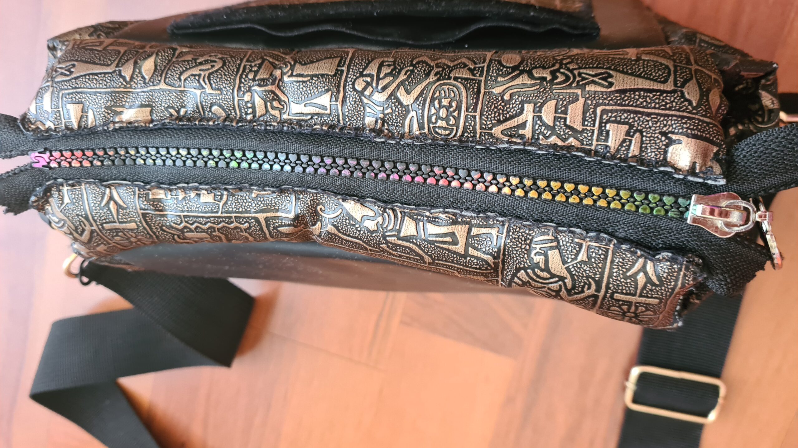 Umetno usnje z egipčanskim motivom. Malček kombinirana z žametom. Obesek mala piramidica.