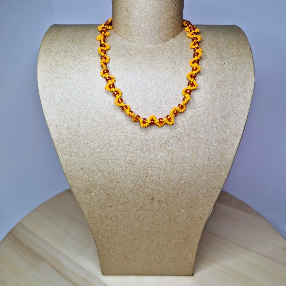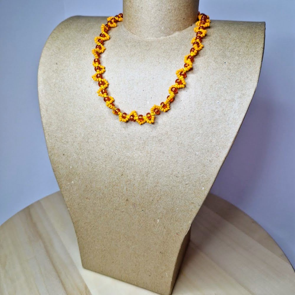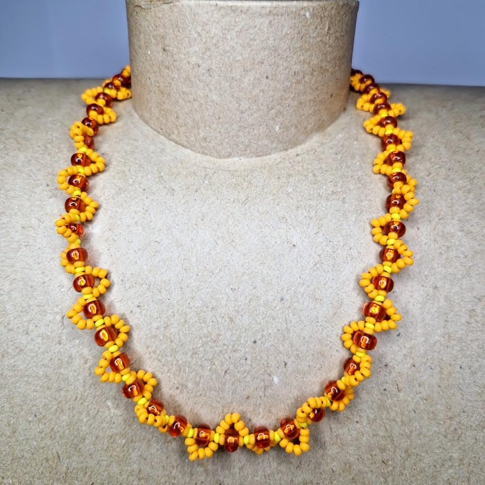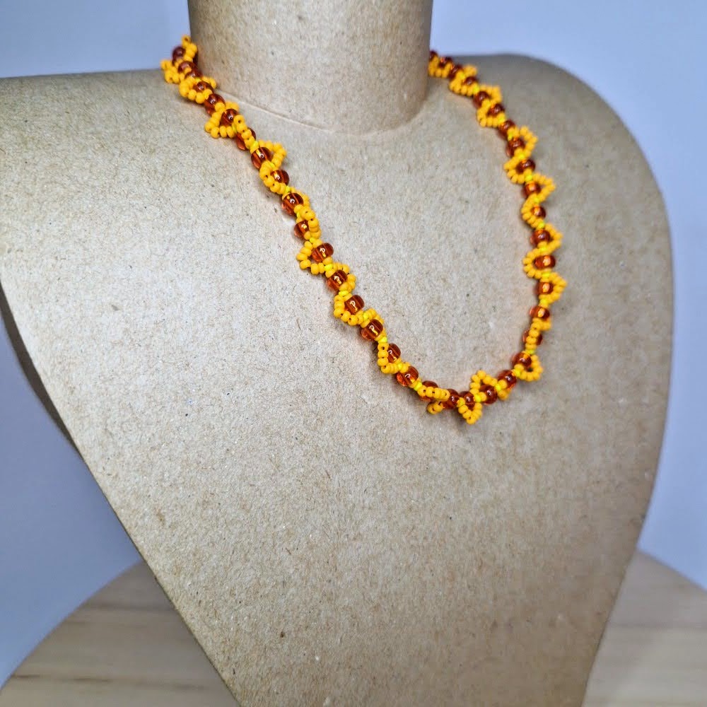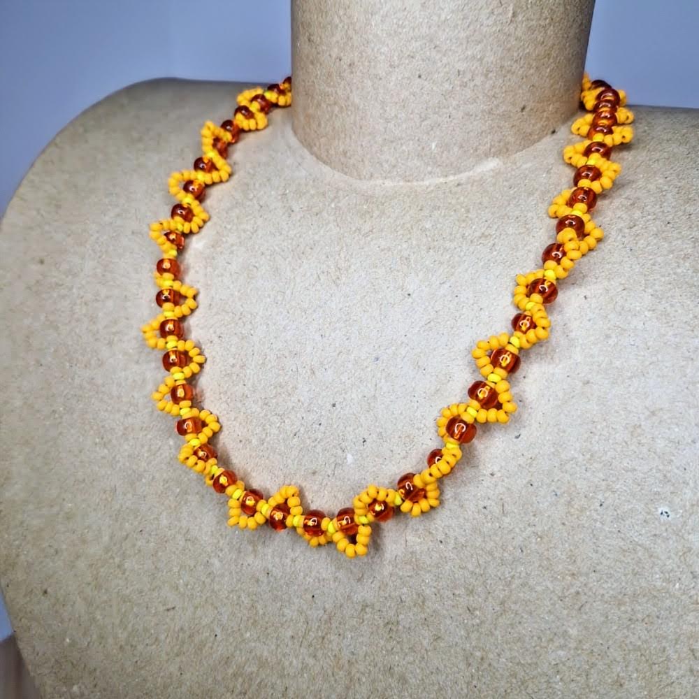 Discover the magic of this handcrafted necklace, which will take you into the world of magic and spirituality! Each bead, carefully woven into an intricate pattern, combines vibrant yellow and warm orange hues, carrying deep symbolic meanings.