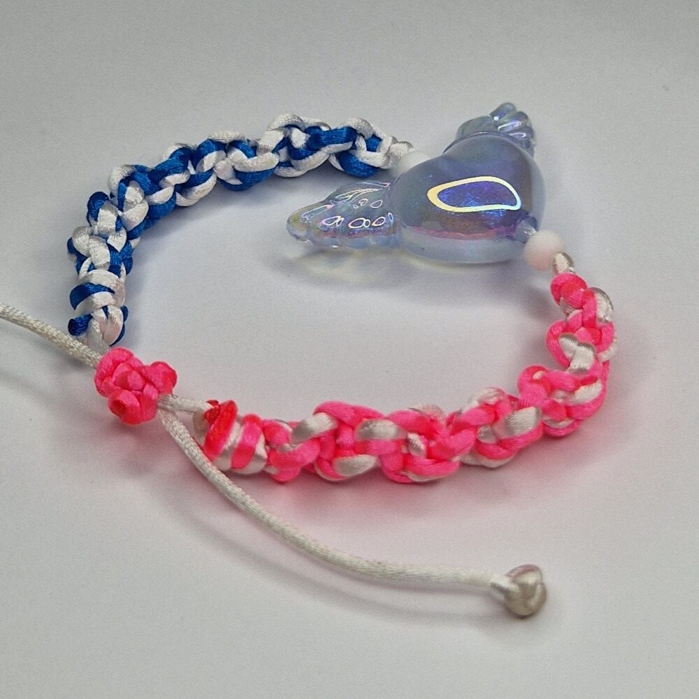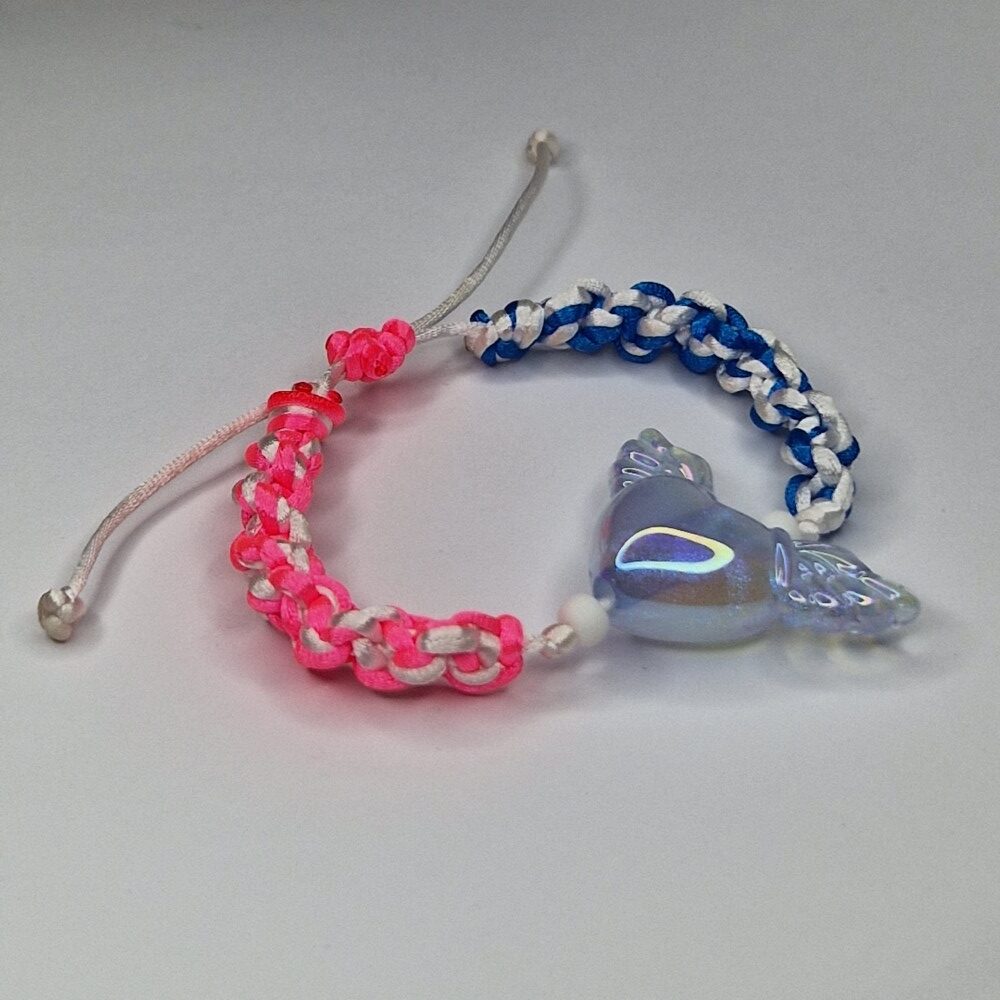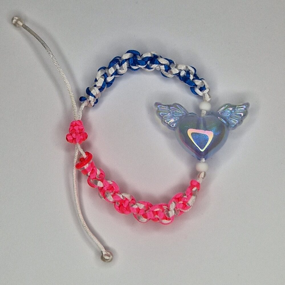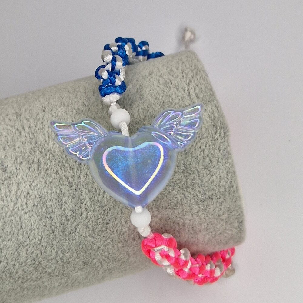 This handcrafted macrame bracelet is more than just an accessory—it’s a symbol of balance, unity, and divine connection. On the left side, the intertwining white and blue strings represent the serenity of the sky and the purity of the soul, bringing calmness and clarity to your mind. On the right side, the gentle fusion of white and pink embodies love, compassion, and inner peace, inviting warmth and emotional healing into your life.